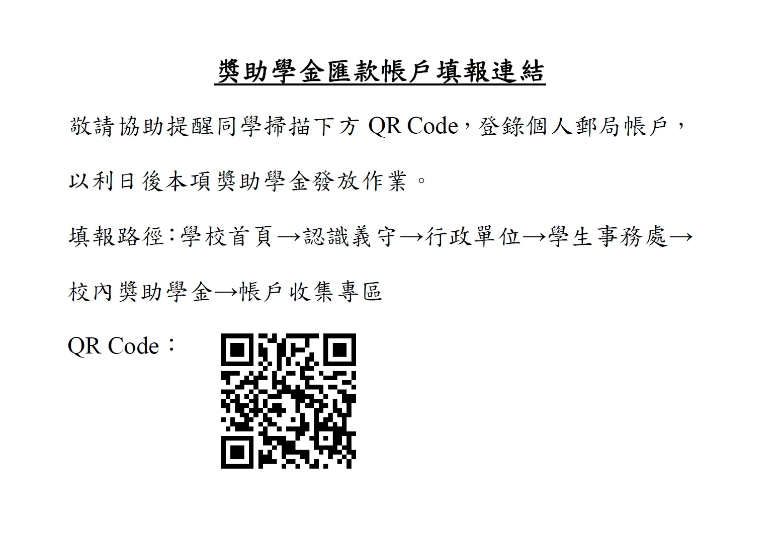 (一)請協助通知符合資格但尚未登入郵局帳戶的同學於115年3月27日前線上登入郵局帳戶。
