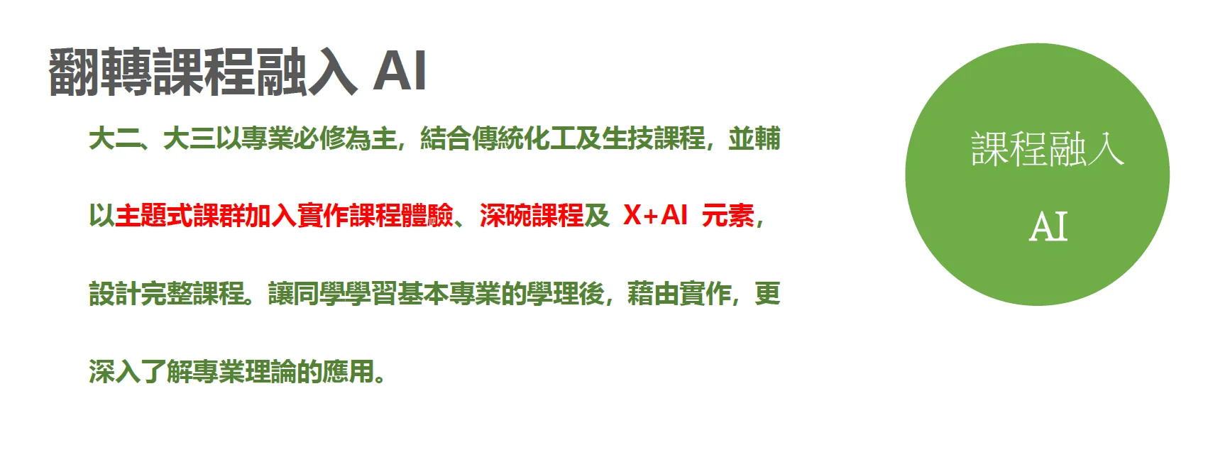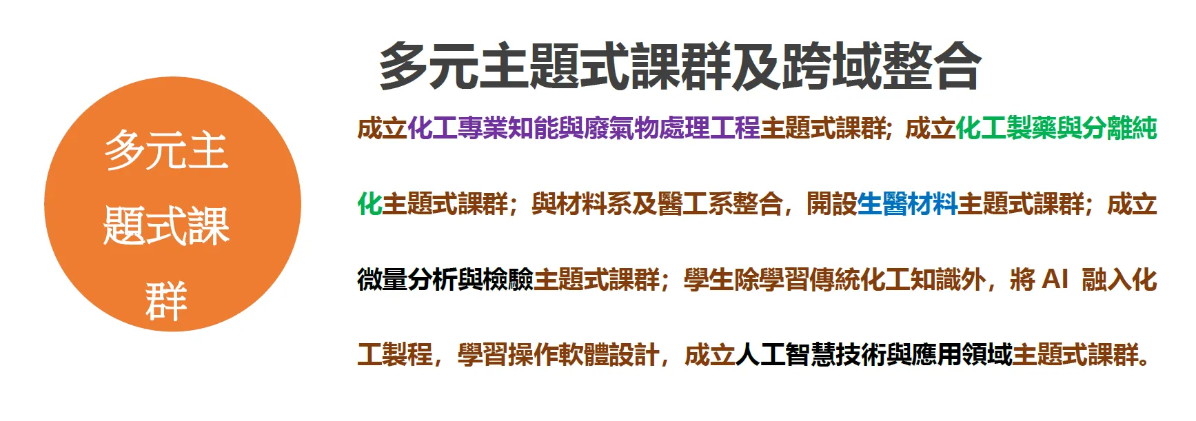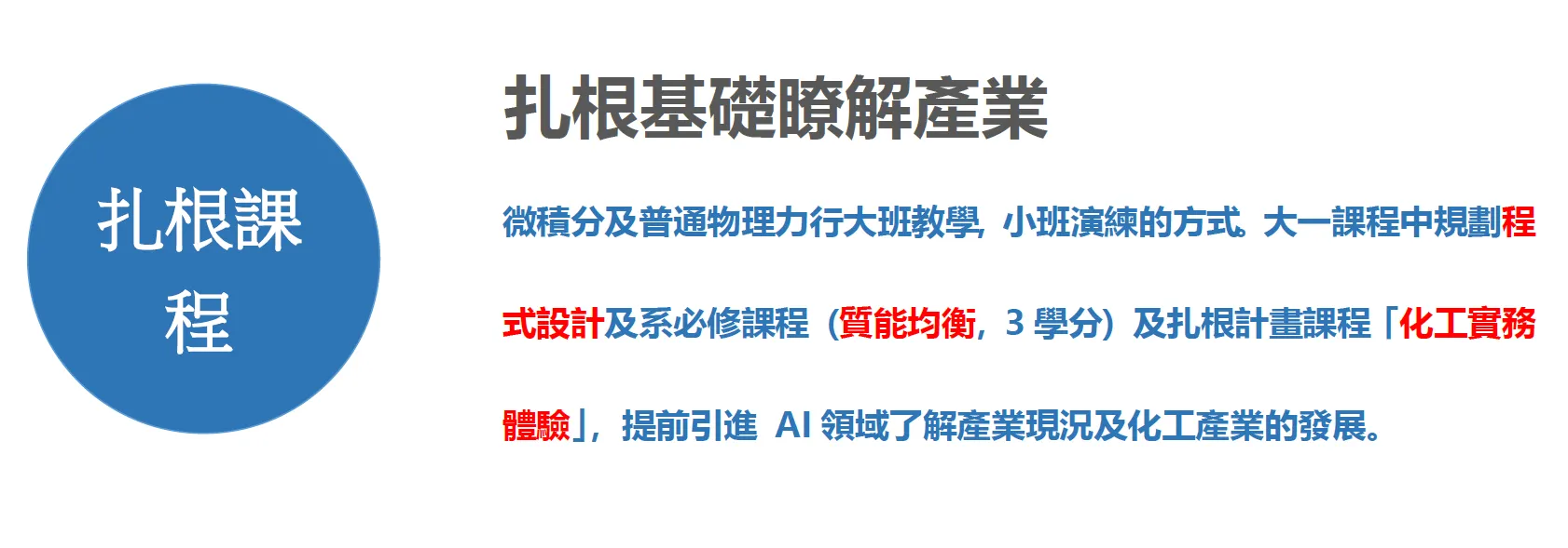 多元主題式課群 AI融入課程札根課程扎根基礎瞭解產業 微積分及普通物理力行大班教學,小班演練,或是小班教學小班演練的方式。大一課程中規劃程式設計及系必修課程 (質能均衡,3學分) 及扎根計畫課程「化工實務體驗」,引前進 AI領域了解產業現況及化工產業的發展。系友演講工廠參觀主題實作