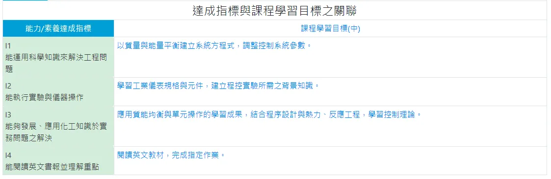 本課程共分成六個主要單元:工程系統之(莫耳數、密度、濃度)程序平衡、解決程序控制問題的策略、化學反應方程式及化學計量平衡與計算、氣-液兩相程序系統、能量程序平衡、反應性系統之焓與商值變化。
